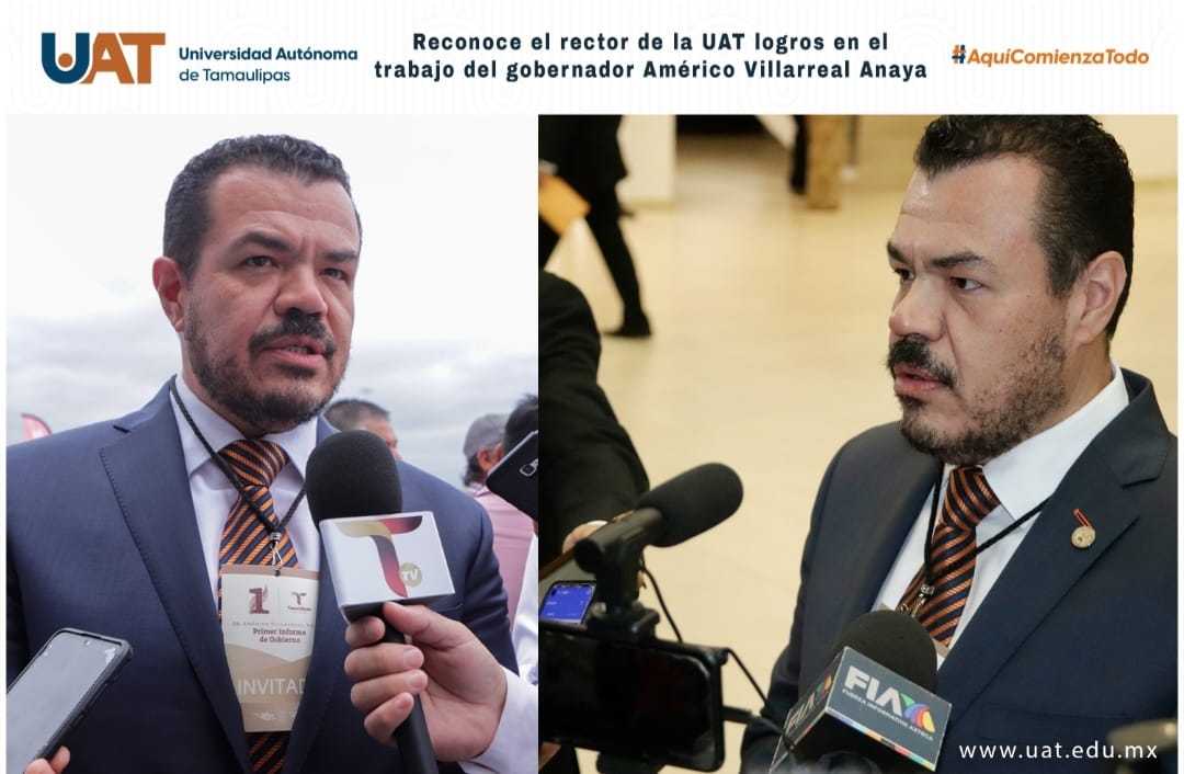 El C. P. Guillermo Mendoza Cavazos, rector de la Universidad Autónoma de Tamaulipas (UAT), reconoció el trabajo del gobernador Américo Villarreal Anaya, gracias al cual la entidad ha visto mejoras en rubros importantes para el bienestar de las familias tamaulipecas.