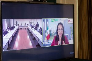 En la reunión efectuada en el Centro de Excelencia del Campus Victoria, con la asistencia de titulares de las diferentes secretarías de la Rectoría, el C.P. Mendoza Cavazos dio la bienvenida a la Dra. Olga Hernández Limón, Coordinadora de Vinculación del COPAES, quien participó por videoconferencia con la exposición de las observaciones de este organismo para el mejoramiento de la calidad de la gestión institucional.