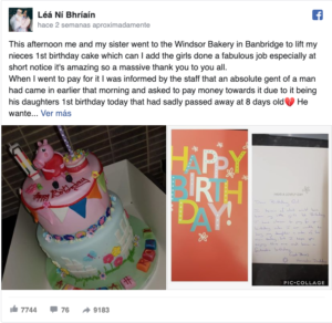 Cuando Léá Ní Bhríaín fue junto a su hermana a recoger la tarta a una pastelería de Banbridge (Irlanda del Norte), el personal del establecimiento les comunicó que otra persona ya había pagado por ella.
