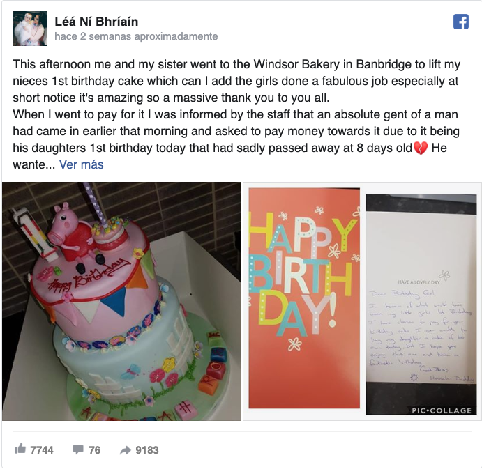 Cuando Léá Ní Bhríaín fue junto a su hermana a recoger la tarta a una pastelería de Banbridge (Irlanda del Norte), el personal del establecimiento les comunicó que otra persona ya había pagado por ella.