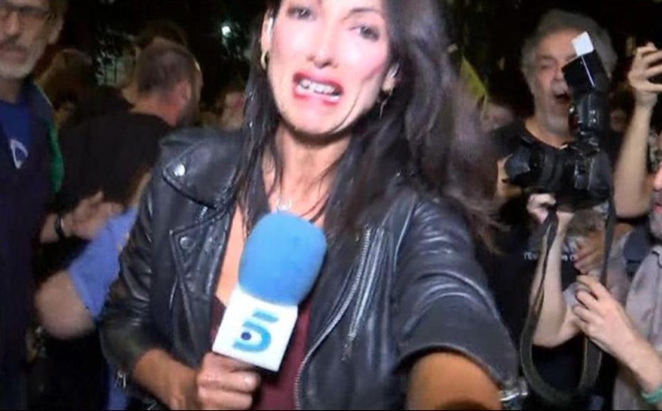 Laila Jiménez, reportera de Informativos Telecinco, intentaba hacer una transmisión en vivo cuando los manifestantes comenzaron a empujarla, insultarla y exigirle que se fuera, además de que, según informó el noticiero, le arrojaron un líquido a la cabeza.