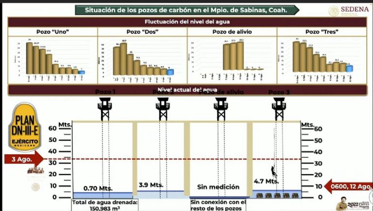 La funcionaria federal detalló vía remota desde el lugar de los hechos que ya se ha extraido un 97 por ciento del agua que permanecía en los pozos y que en la madrugada retiraron parte del material, por lo que ya existen las condiciones necesarias para que equipos de rescate ingresen hoy mismo a la mina en busca de los trabajadores.