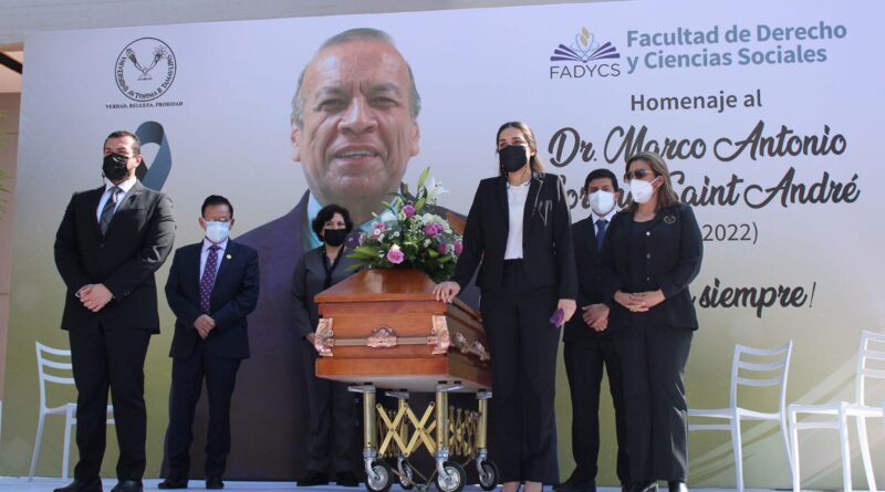 El homenaje de cuerpo presente se llevó a cabo este lunes 31 de enero en la explanada de la FADYCS con la asistencia de la familia del Dr. Cortina Saint André, directores y directoras de las facultades del Centro Universitario Sur, docentes, personal directivo, administrativo y estudiantes del plantel.