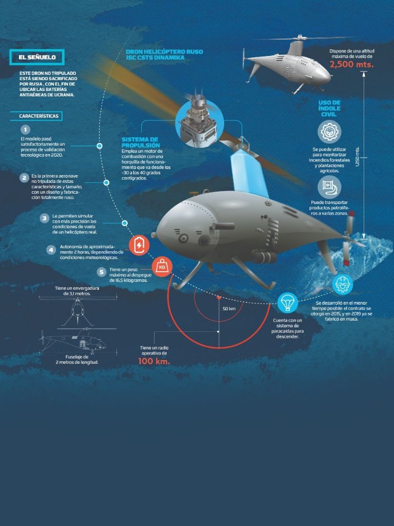 El modelo de dron que ha sacrificado Rusia para desvelar posiciones enemigas está especialmente concebido para servir de banco de pruebas. «El sistema está destinado a simular aviones teledirigidos y helicópteros de baja velocidad en los ensayos de armas experimentales», comentó la oficina de prensa de JCS CSTS Dinamika, el fabricante.