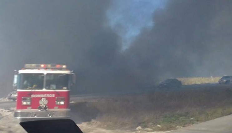 Camiones y pipas del Heroico Cuerpo de Bomberos atendieron el llamado y los elementos comenzaron a dar combate al siniestro mientras el humo invadía la carretera Reynosa y el libramiento Marte R. Gómez.