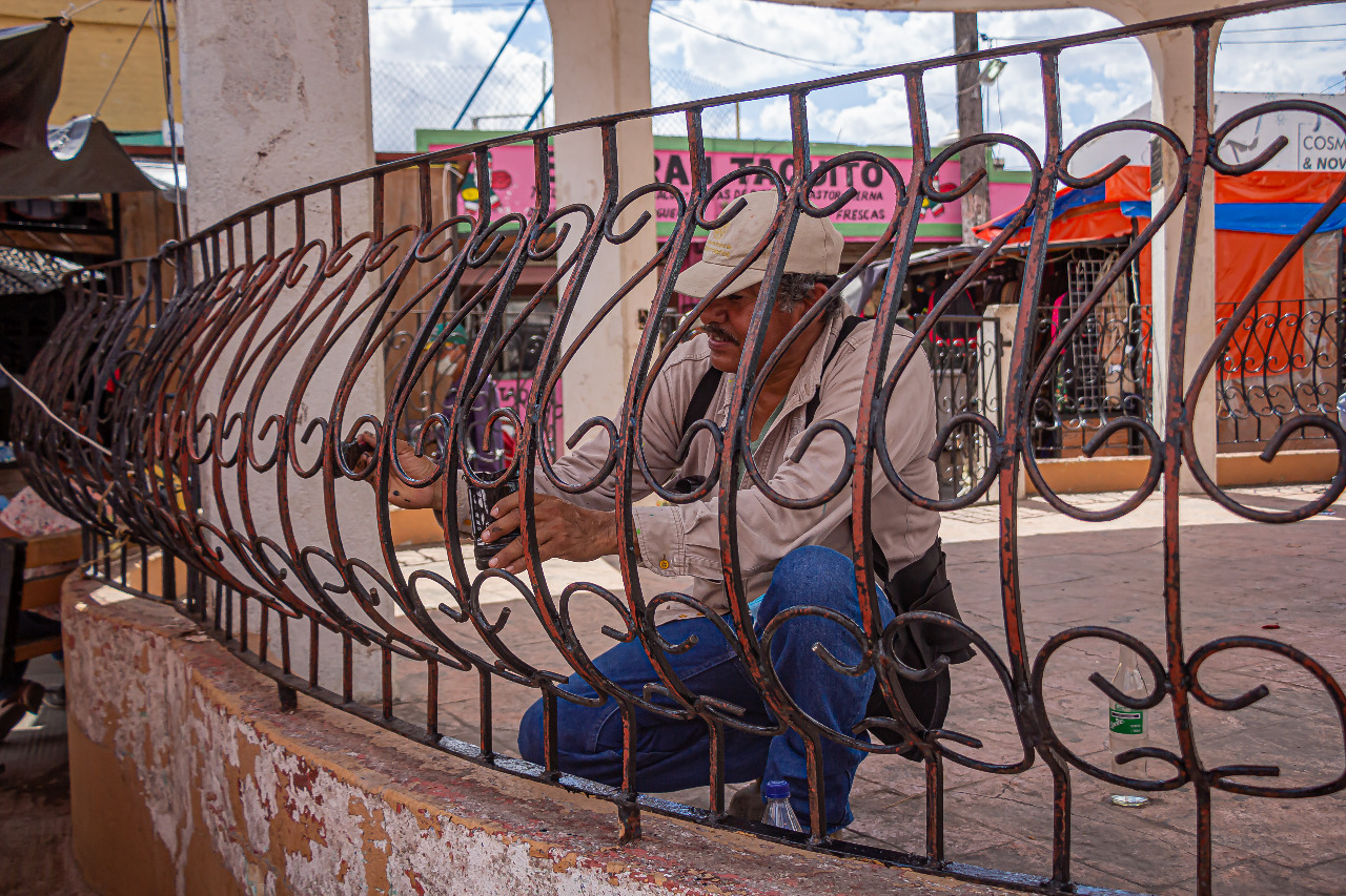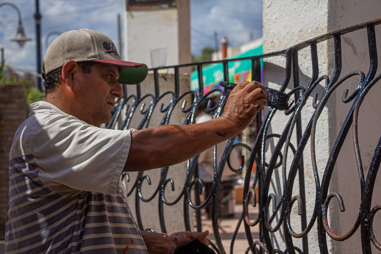 Este día los empleados trabajan en el pintado de barandales y estructura del kiosko de la citada zona comercial.
