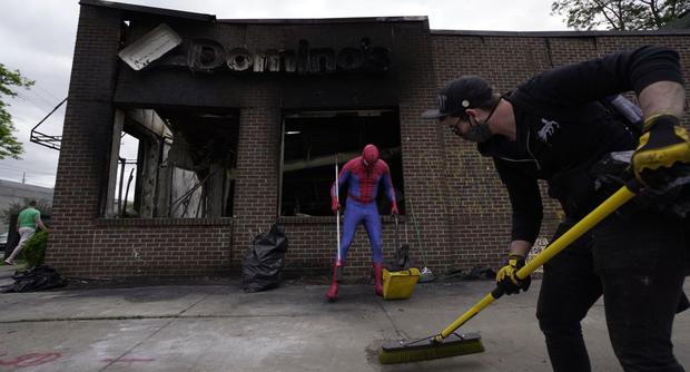 Ya en la mañana, tras el caos de toda la noche, varios vecinos salieron a las calles para limpiar la destrucción post protestas. Pero quizá en Minneapolis, lugar donde todo inició, se vieron las escenas más conmovedoras y llamativas. Desde familias enteras recogiendo escombros, hasta un individuo disfrazado de Spiderman.