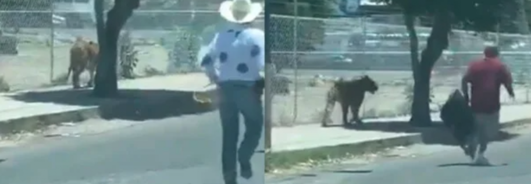 En una videograbación captada por un automovilista se aprecia al felino caminar por una acera, y detrás de él un grupo de hombres, con botas, camisa a cuadros, y sombreros, que intentan capturarlo.