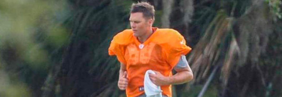 Brady no fue el único quarterback. Pero él era el único jugador que vestía una camiseta de práctica de color naranja brillante sobre las hombreras con su casco de Buccaneers.