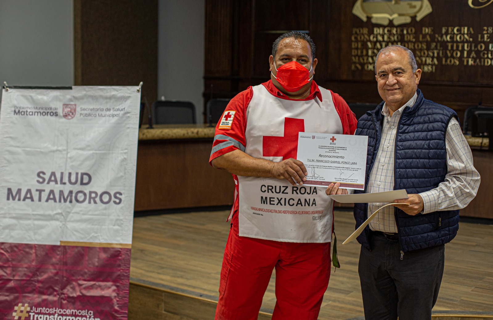 Al término de tres capacitaciones que se brindaron a empleados municipales, García Fuentes con la representación del alcalde Mario Alberto López Hernández entregó reconocimientos a los elementos de la Cruz Roja que impartieron la capacitación, entre ellos, a Francisco Ponce Lara, coordinador de Socorro de la misma institución.