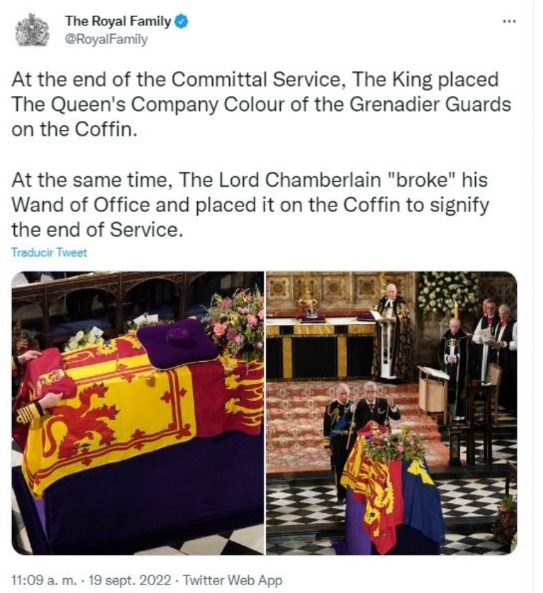 La «segunda era isabelina» llegó simbólicamente a su fin cuando el más alto funcionario de la casa real rompió la vara de mando de la soberana, que será inhumada en una ceremonia privada prevista a las 19:30 horas en una capilla anexa.