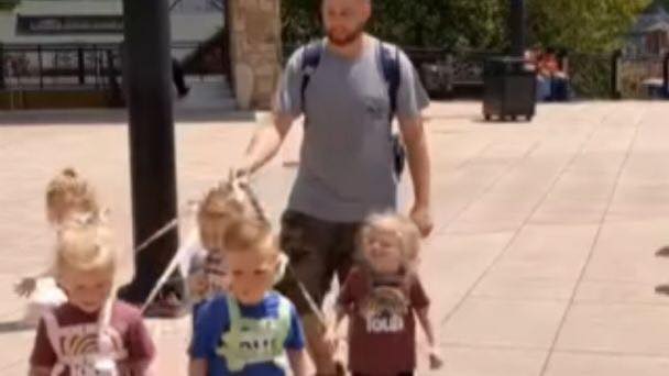 Un padre de cinco hijos provocó una furiosa polémica tras compartir un video en el que aparece usando una correa para llevar a sus quintillizos de cinco años a dar un paseo.