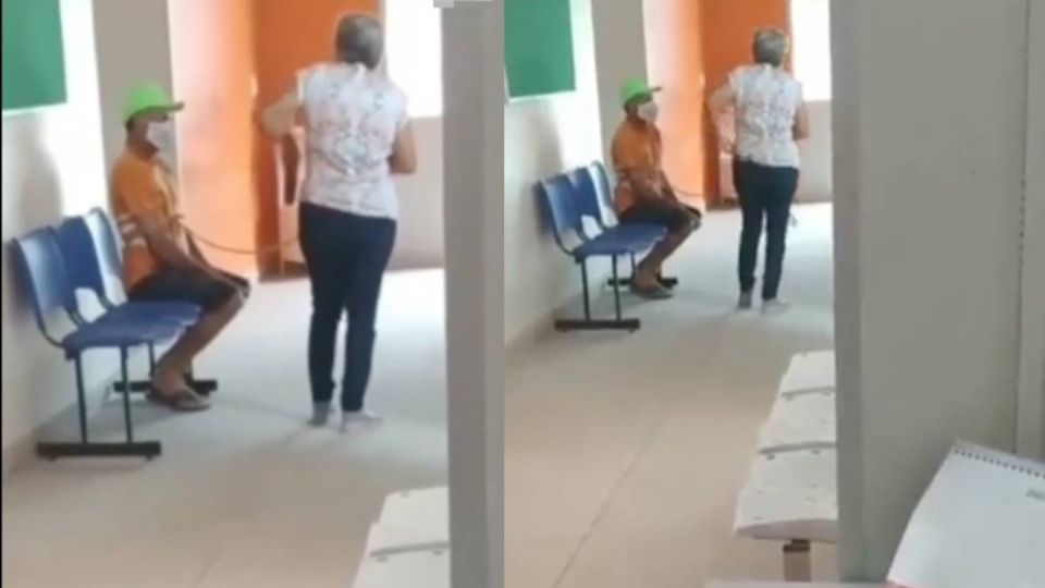 En el clip compartido en las redes sociales se ve a la mujer estar de pie frente a su esposo quien permanece sentado en la sala de espera del nosocomio mientras permanece amarrado con una cuerda en sus brazos y torso.
