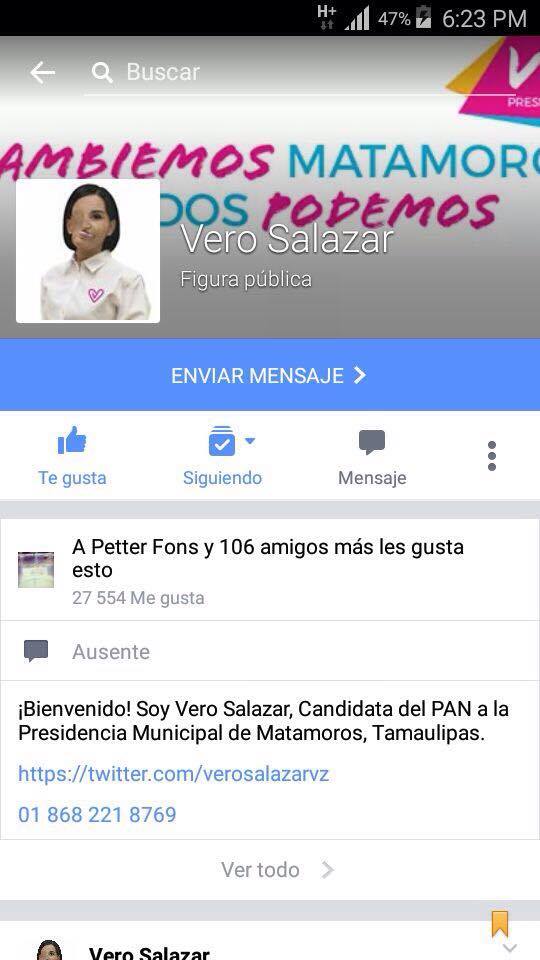 Es la candidata del PAN a la alcaldía de Matamoros Veronica Salazar, quien aparece como puntera con más likes en su pagina de facebook.