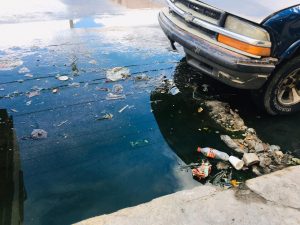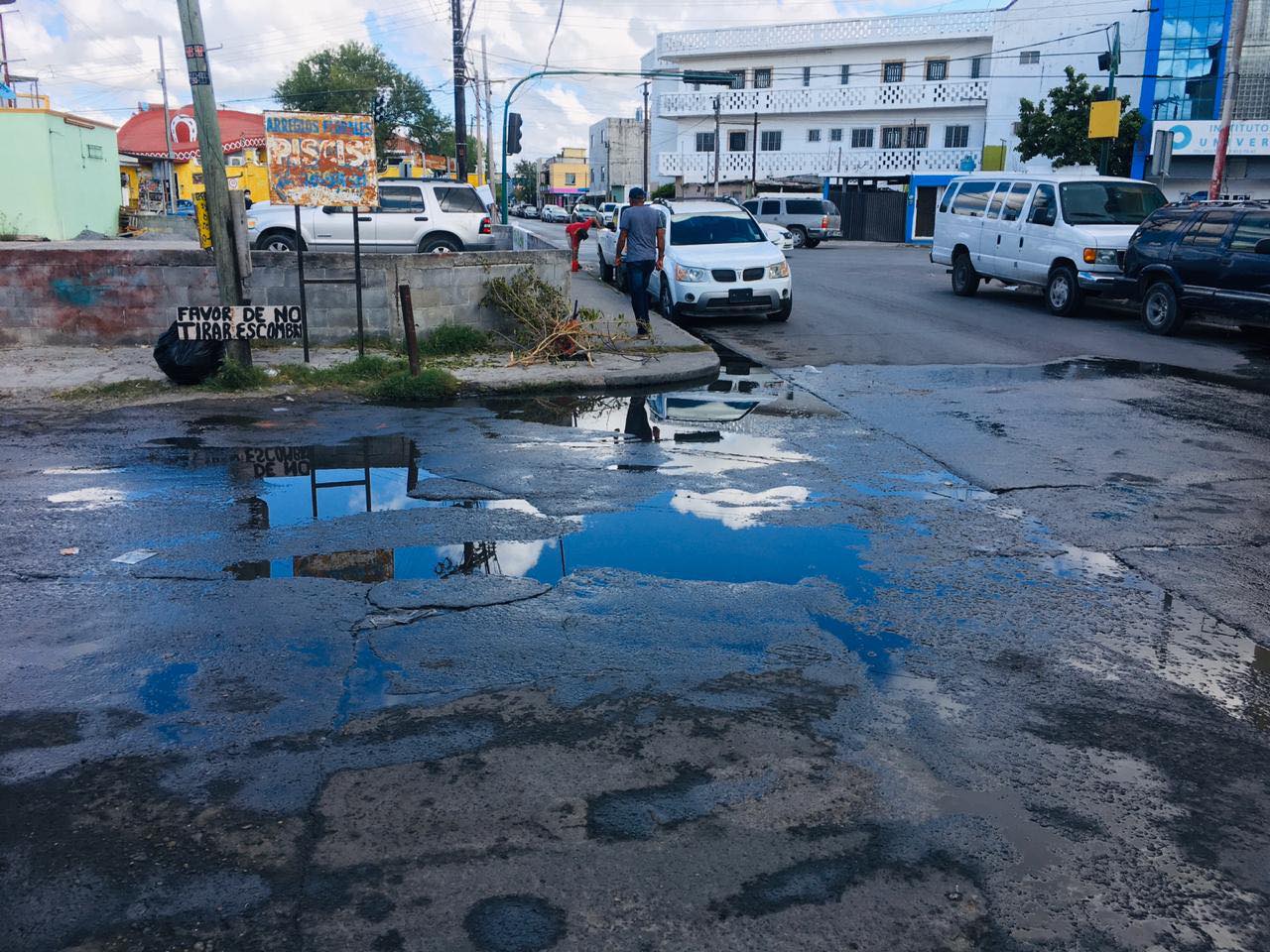Los fétidos olores que emanan de dicha Laguna de agua sucia ha causado una gran contaminación ambiental para los vecinos de este lugar, que a pocos metros hay un negocio de tacos con un entorno insalubre a causa de esta fuga del drenaje.